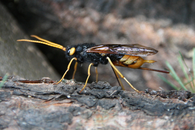 Między zestawem tylnych nóg ma takie czarne coś czym chyba składa jajka do drewna. Drewno było świeżo ścięte, więc praktycznie żywe. Modrzew. Zwierz jest większy od normalnej osy, trochę mniejszy od szerszenia (na długość).