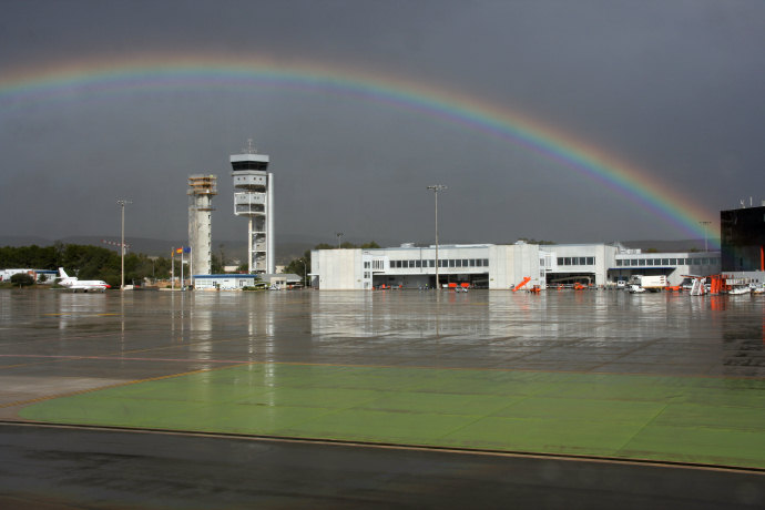 Tęcza nad lotniskiem. Warto zauważyć, że tęcza jest między mną a lotniskiem, a nie za lotniskiem.