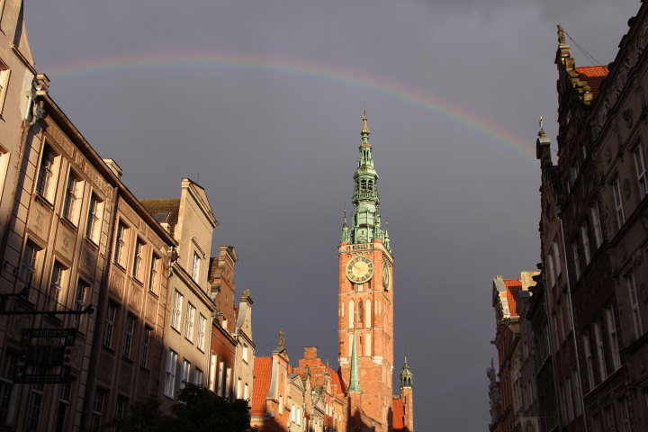Tęcza nad wieżą Ratusza Głównego Miasta