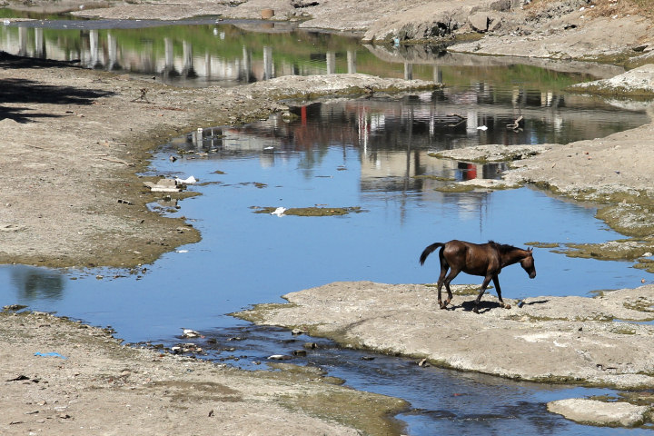 Koń hengałtuje nad rzeką.