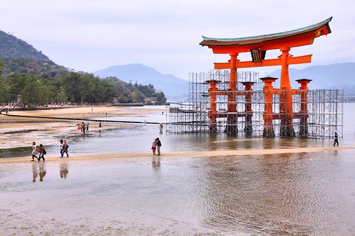 Słynna brama torii chramu Itsukushima obejmującego całą wyspę Miyajima. Jak się okazuje, nawet brama torii może być w remoncie - szczęściarz ze mnie ;] Zależnie od pływu, brama stoi w wodzie lub nie. Ponoć przejście pod nią daje szczęście.