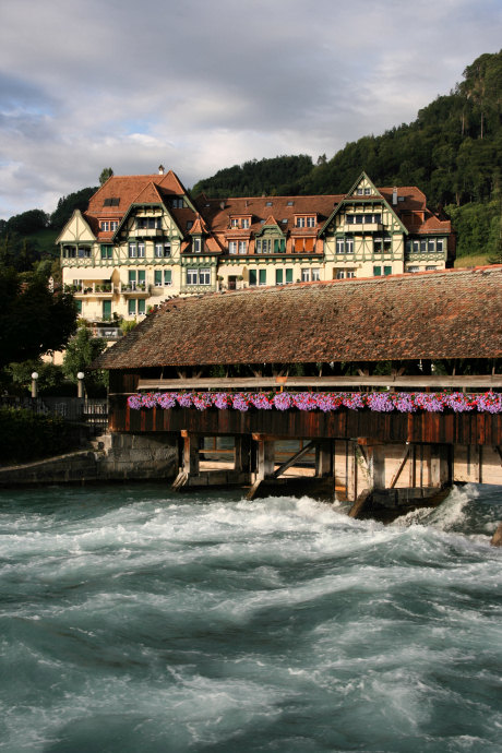 Na pierwszym planie drewniany most-zapora, na drugim planie hotel