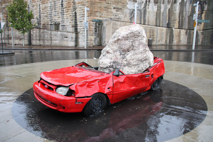 Dzieło sztuki: "Martwa natura z samochodem i kamieniem". Naprawdę tak się nazywa. Facet, który zrobił tą "rzeźbę" kupił specjalnie w tym celu samochód Ford Festiva z komisu za równowartość około 20.000zł.