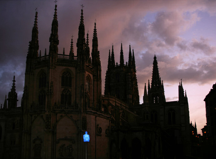 Katedra o zachodzie słońca. Ta niebieska plama to pulsująca na różne kolory sztuka nowoczesna.