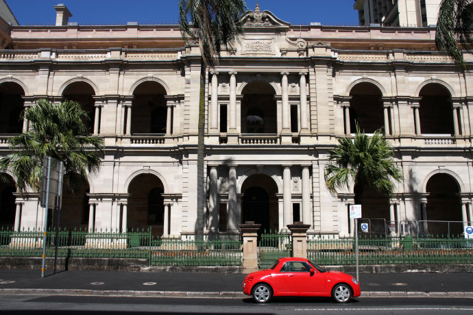 Przedziwna czerwona bryka przed parlamentem stanu Queensland