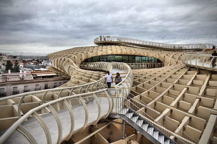 Metropol Parasol - ciekawa budowla przedefiniowująca wielki plac w centrum miasta. Autor twierdzi, że to największa na świecie budowla drewniana, ale to jakaś ściema. Wszędzie miało jakieś metalowe elementy konstrukcji.