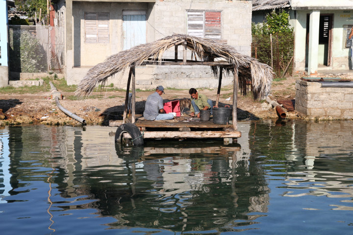 Widok z promu do Jagua. Panowie patroszÄ… ryby.