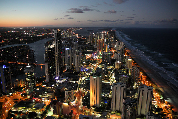 Widok na Surfers Paradise wieczorem z najwyższego budynku mieszkalnego świata - Q1
